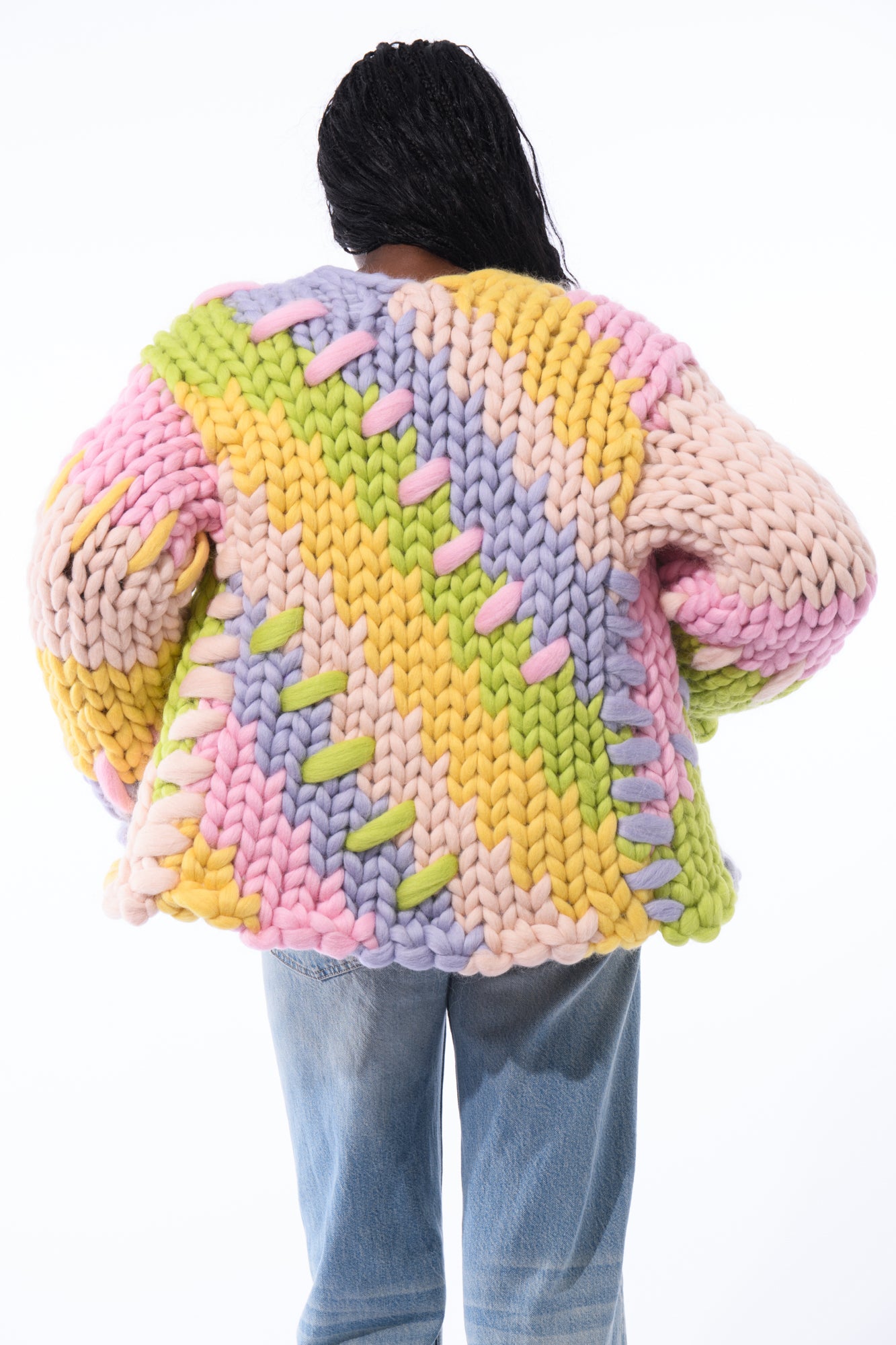 Design details: Featuring our signature colossal knit stitch with diagonal stripes in contrasting pastel colours, alongside unique oversized patchwork stitching and slim bell sleeves.