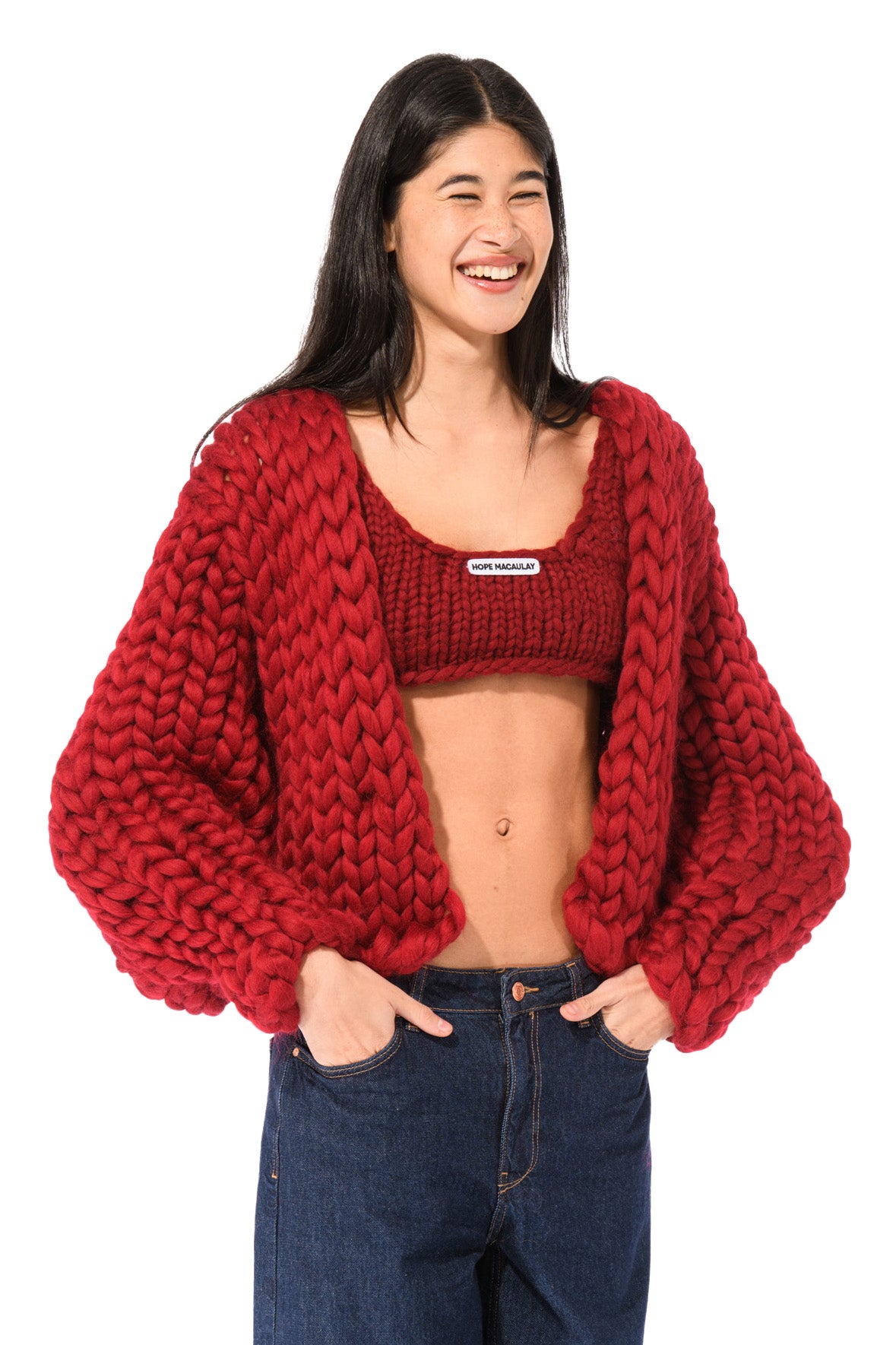 Introducing the Burgundy Colossal Knit Cardigan. A classic statement piece in our famous, signature design.