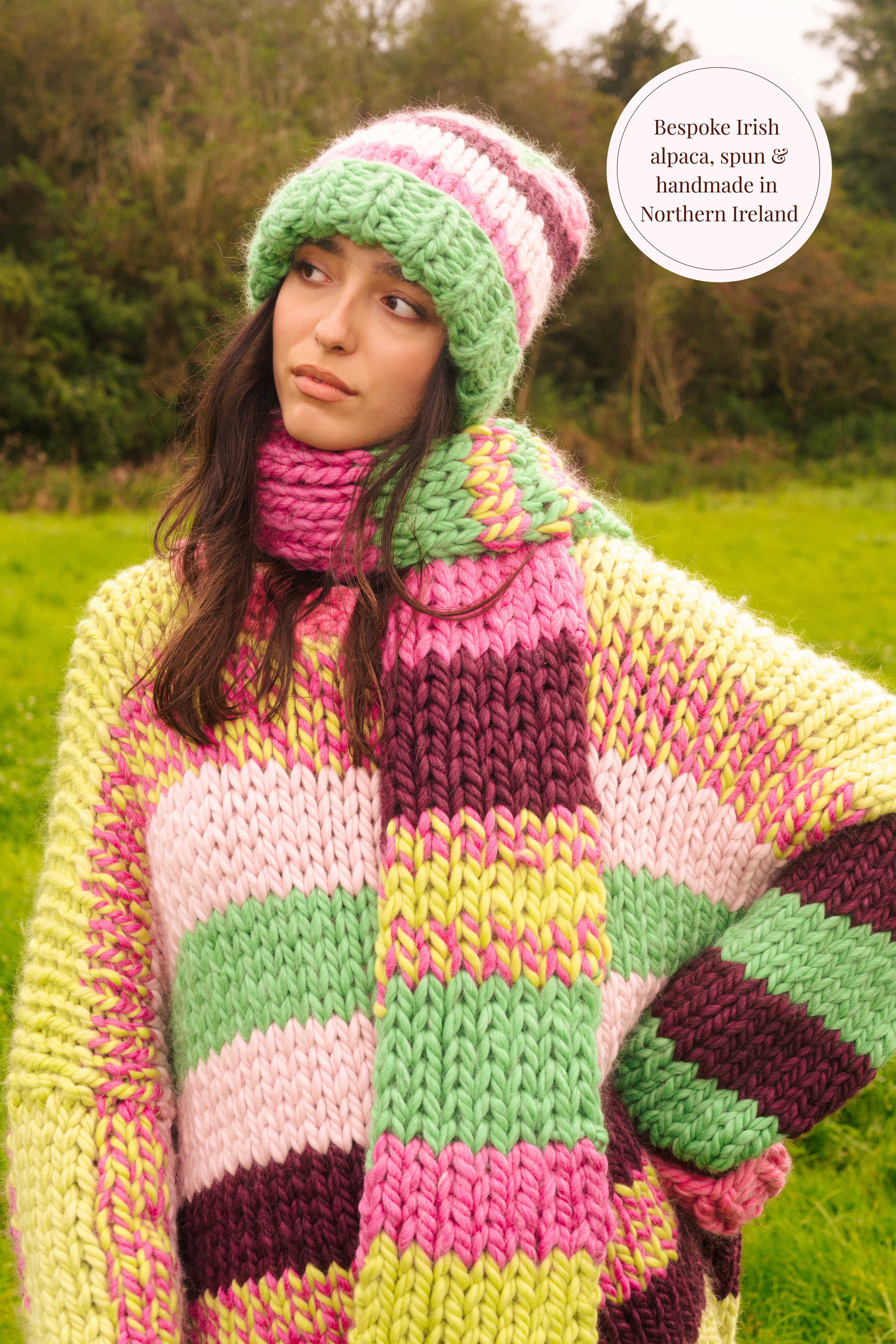 How it’s made: After two years in development, this yarn has been spun just minutes from our studio in Coleraine, Northern Ireland, at a small family-run mill in very limited quantities. Handmade using alpaca sourced from Wicklow, it is designed by Hope in our signature chunky style with a unique marled twist. This one-of-a-kind piece has been lovingly hand-knitted by our talented team of knitters across Northern Ireland, making it a true piece of Irish wearable art. Every hat carries a special label with the name of the knitter who made it, so you’ll know exactly who brought your piece to life. Read more about us here.