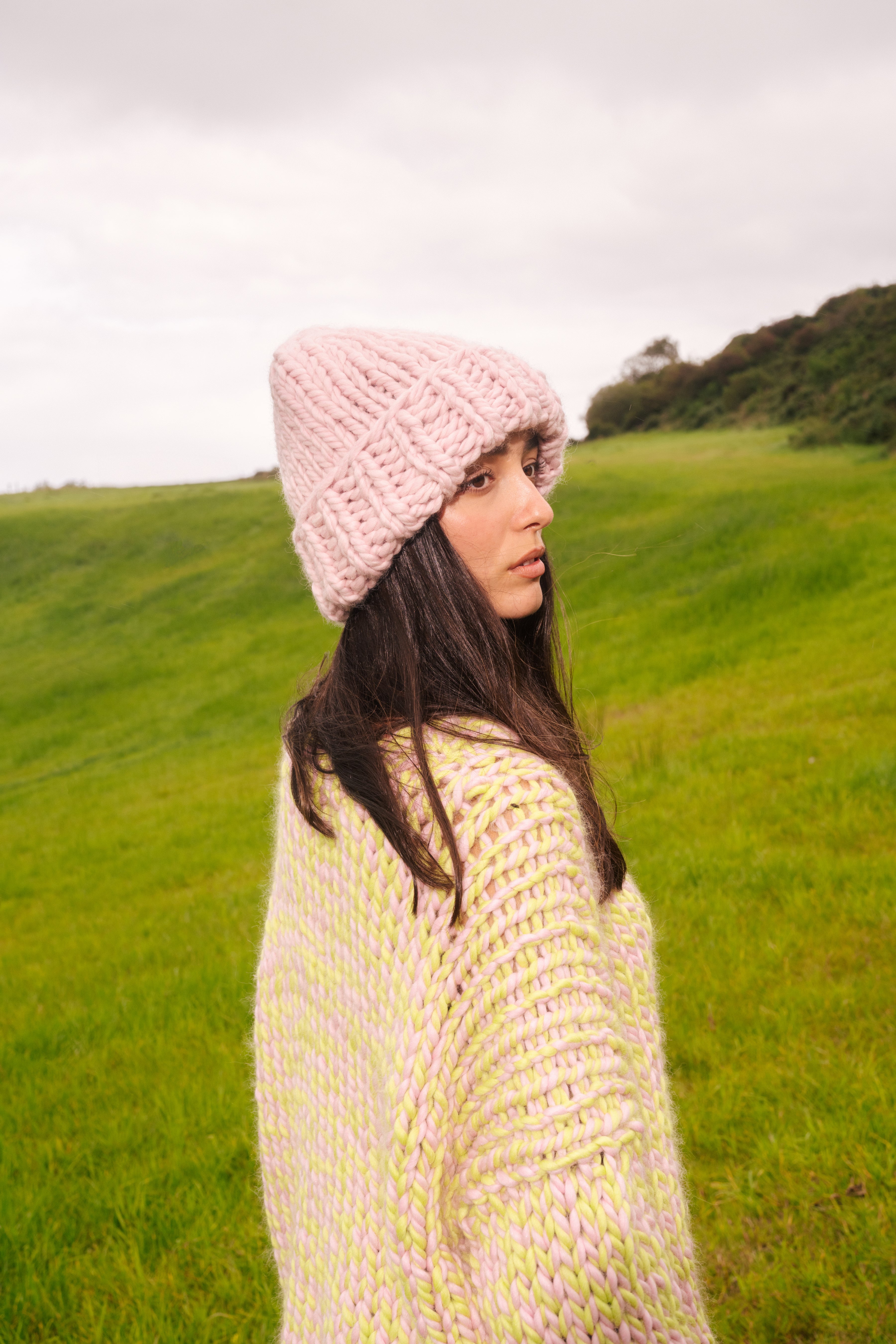 How it’s made: After two years in development, this yarn has been spun just minutes from our studio in Coleraine, Northern Ireland, at a small family-run mill in very limited quantities. Handmade using alpaca sourced from Wicklow, it is designed by Hope in our signature chunky style with a unique marled twist. This one-of-a-kind piece has been lovingly hand-knitted by our talented team of knitters across Northern Ireland, making it a true piece of Irish wearable art. Every hat carries a special label with the name of the knitter who made it, so you’ll know exactly who brought your piece to life. Read more about us here.