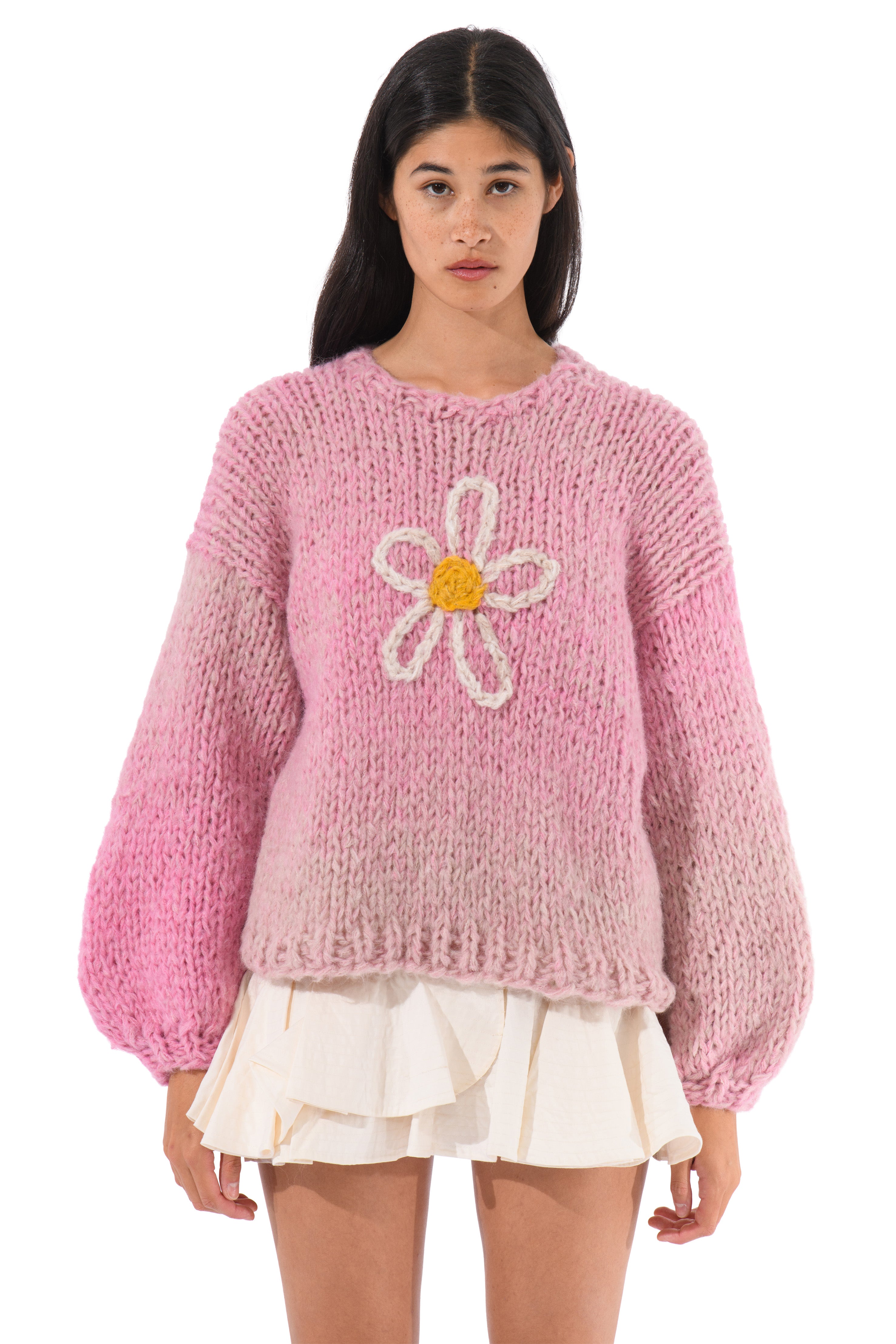 Design details: Boxy sweater fit with balloon sleeves and an embroidered daisy motif.