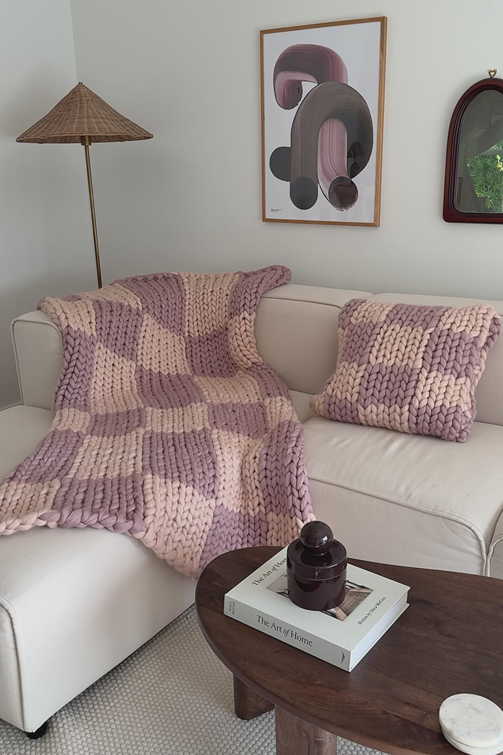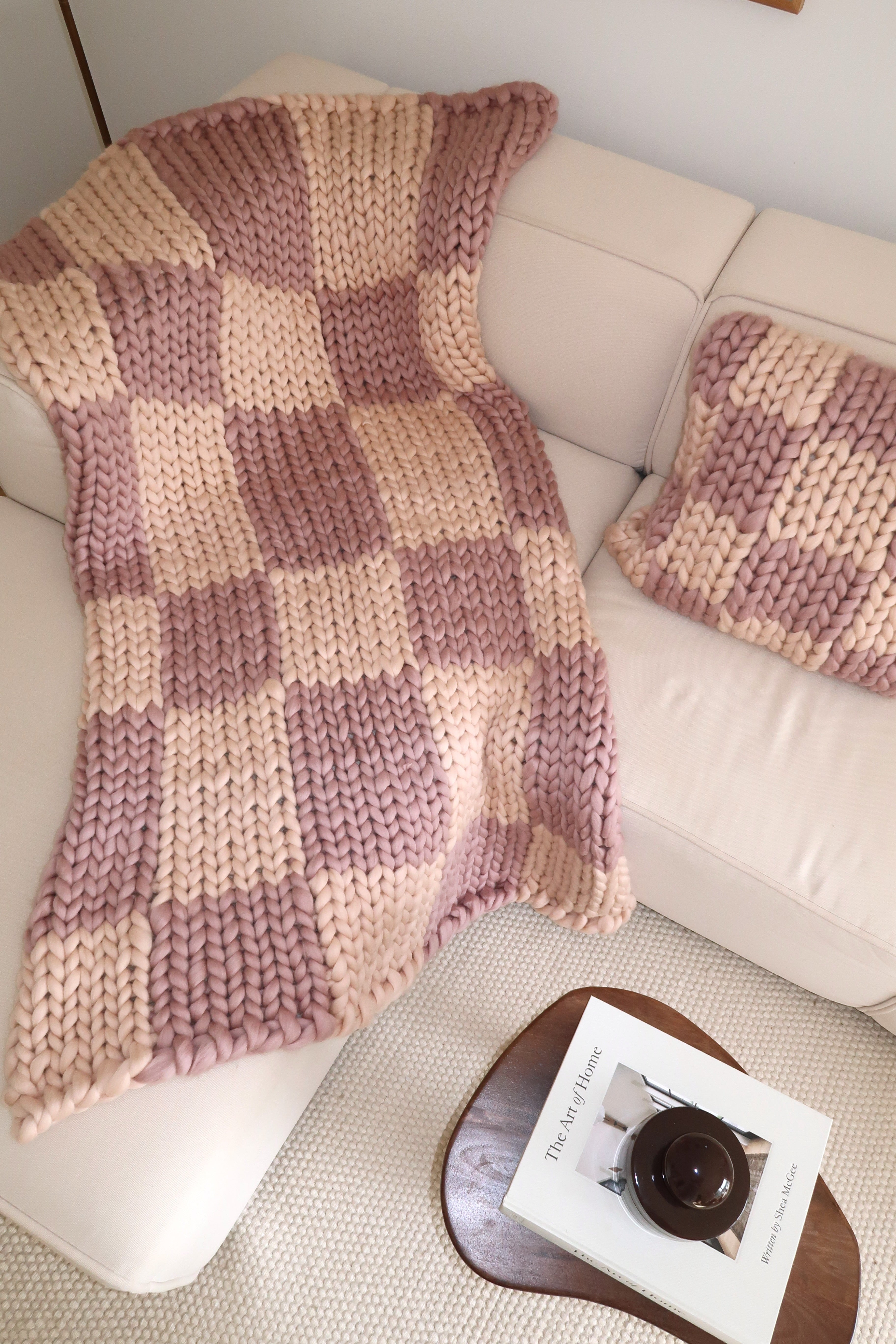Design details: This luxuriously oversized and delightfully chunky colossal knit blanket features a checkerboard design in mauve and dreamy cream.