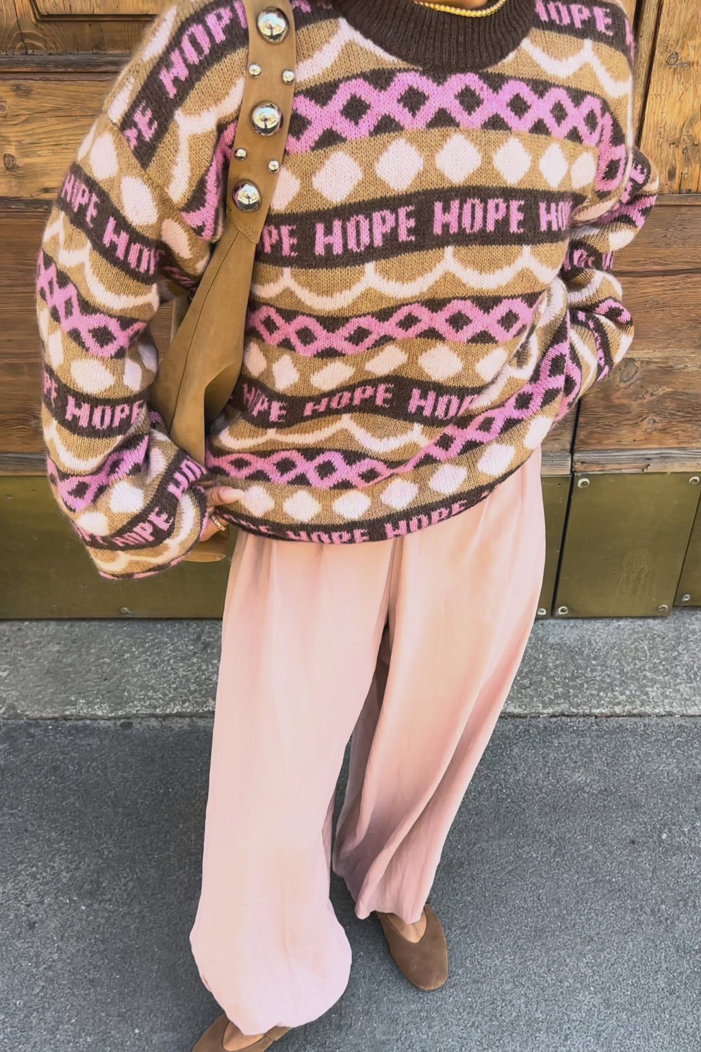 Design details: A contemporary take on Fair Isle, this piece features mocha and pink patterns and playful ‘HOPE’ lettering knitted into the design. The design features soft balloon sleeves and is complete with hand-finished ribbing.
