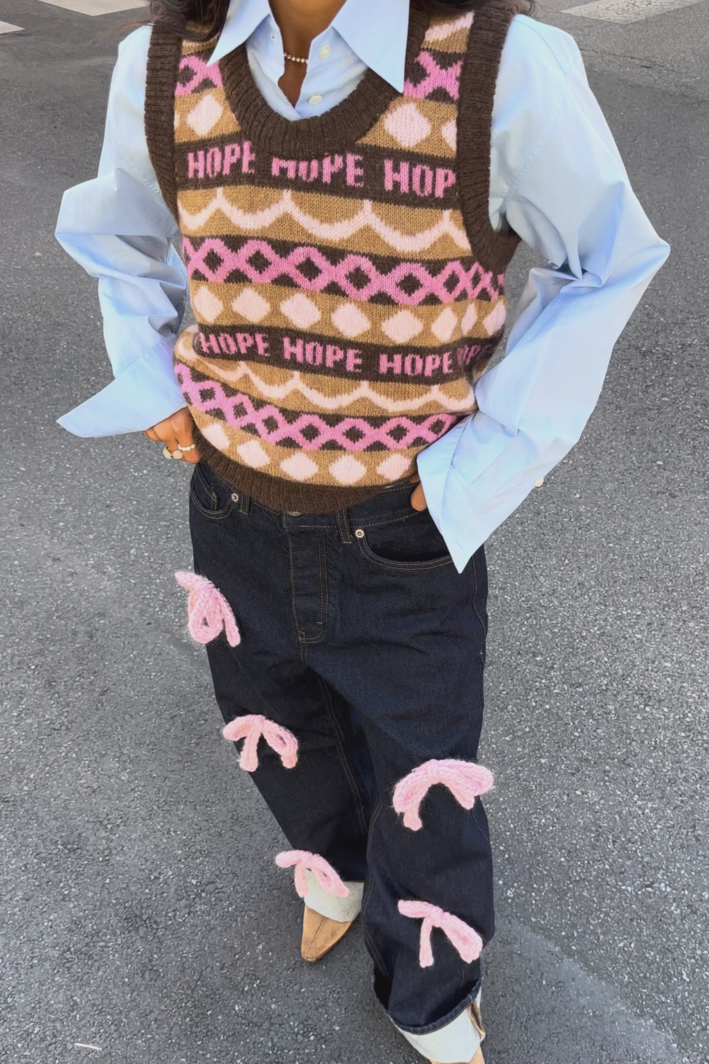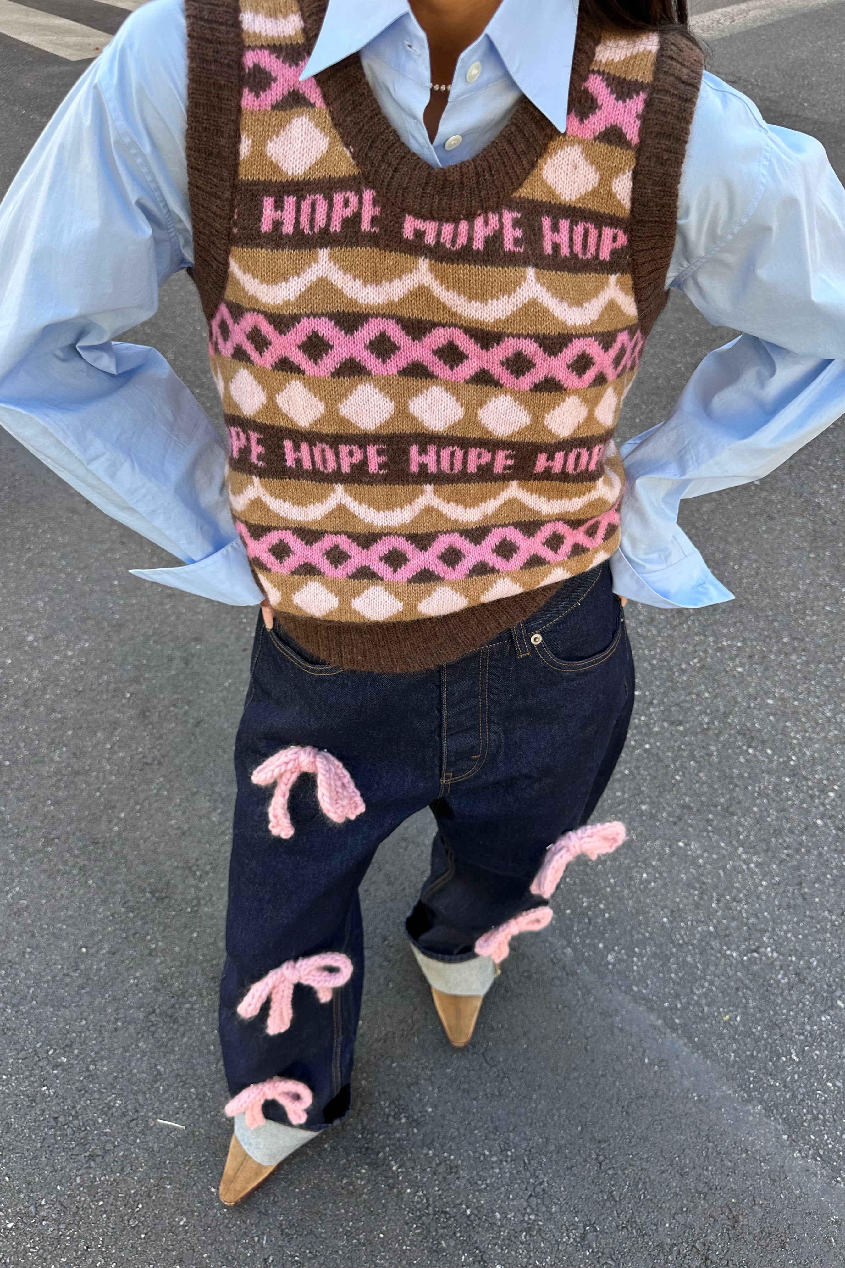 Design details: A contemporary take on Fair Isle, this piece features mocha and pink patterns and playful ‘HOPE’ lettering knitted into the design. Complete with hand-finished ribbing.
