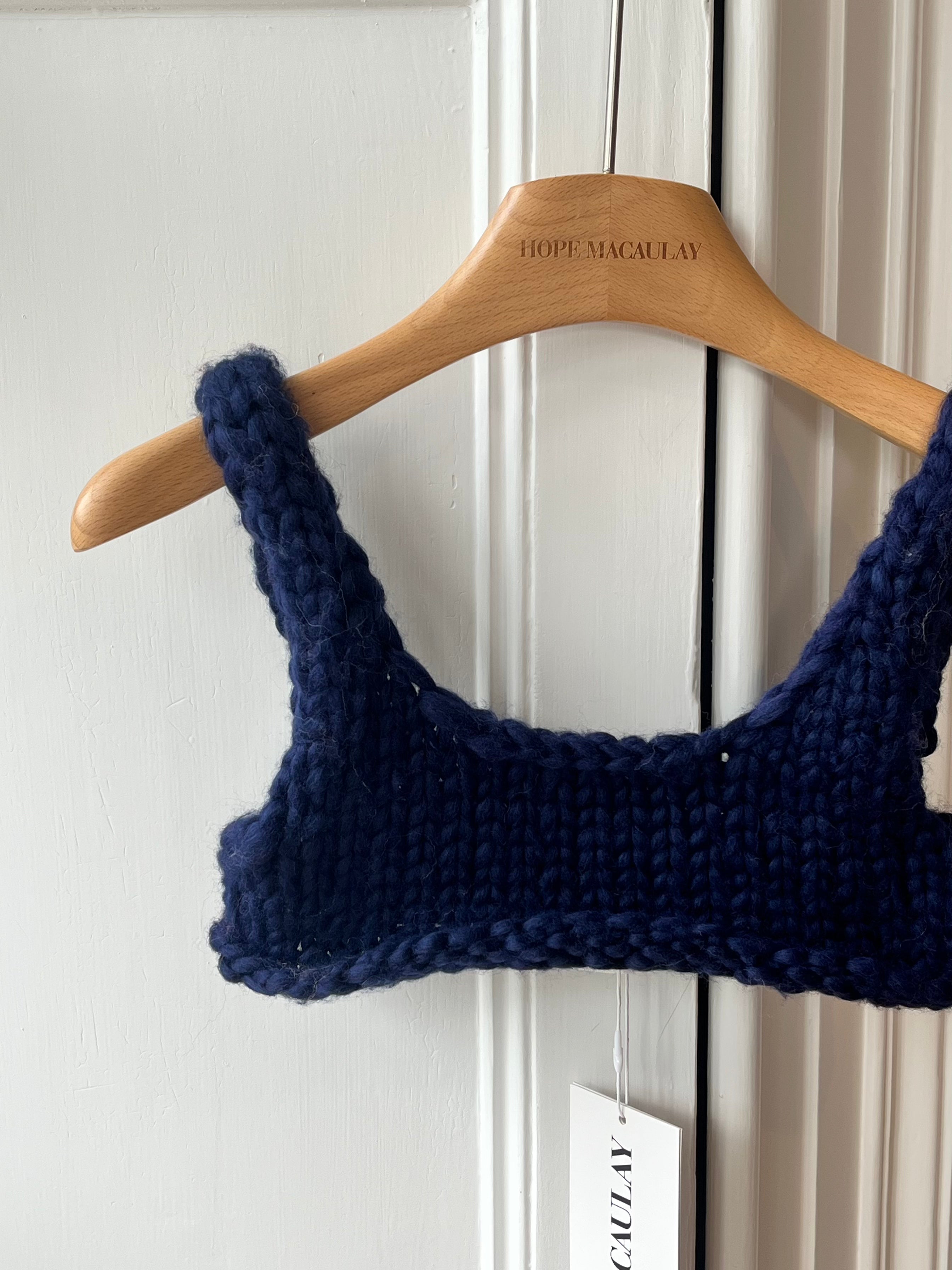 Unsere Grobstrick-Bralettes werden komplett handgefertigt aus hochwertiger Merinowolle für ultimativen Tragekomfort. Die dicken Träger und der einzigartige, kolossale Strickstich sorgen für ein auffälliges Finish.