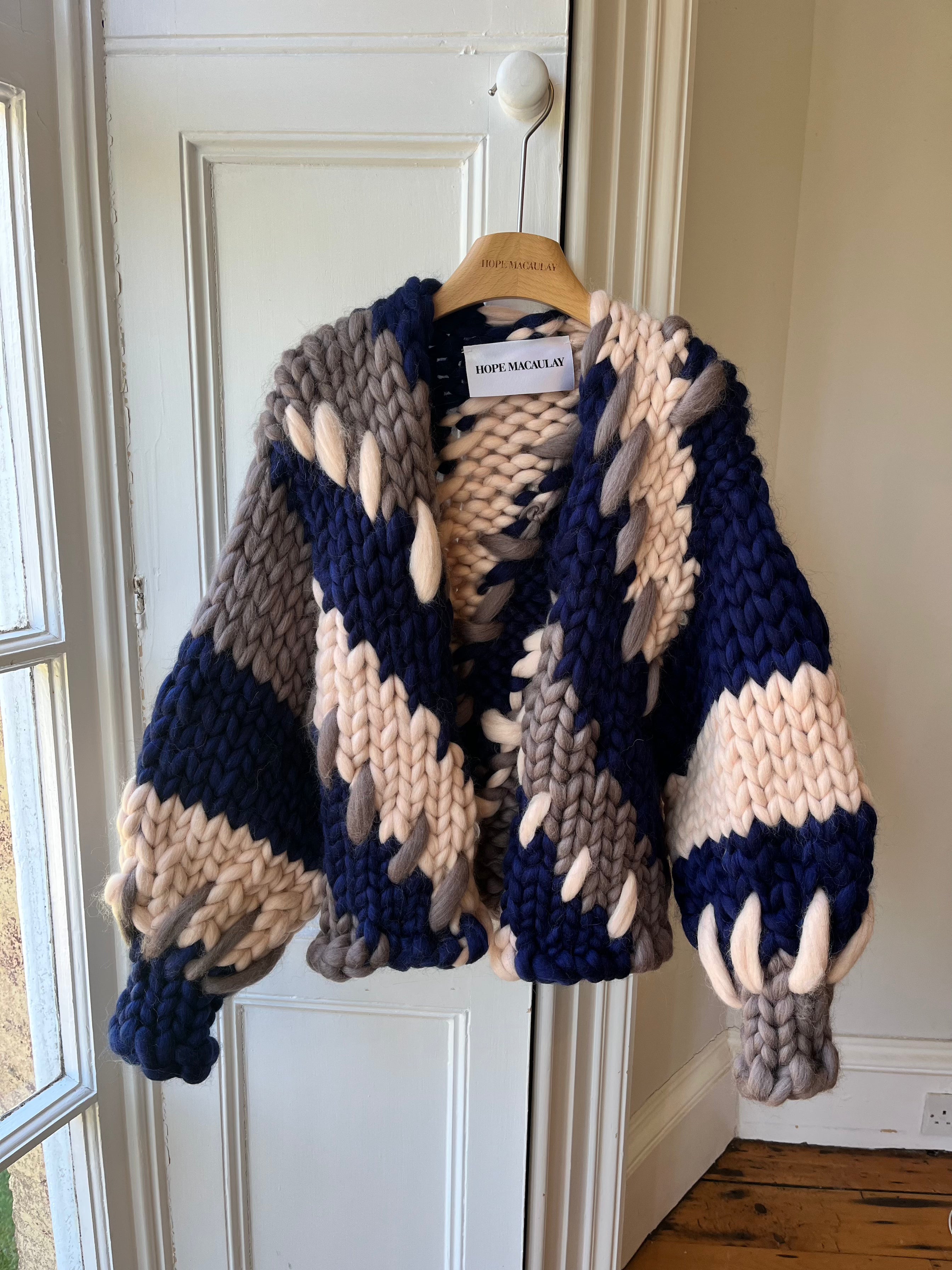 Unsere klassische Midi-Strickjacke aus grobem Strick in Burgunderrot und Marineblau mit besonderen Details. Von unserem Strickteam in Nordirland aus hochwertiger Wolle handgefertigt.