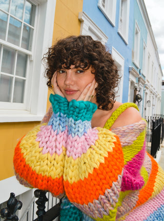 Als Teil unserer Zero-Waste-Initiative wird jede Jacke in Nordirland handgestrickt, wobei hochwertige Restgarne aus früheren Designs verwendet werden. Jedes Stück ist ein Unikat, sorgfältig aus unseren farbenfrohen Wollresten zusammengestellt und wird niemals wieder auf die gleiche Weise hergestellt.